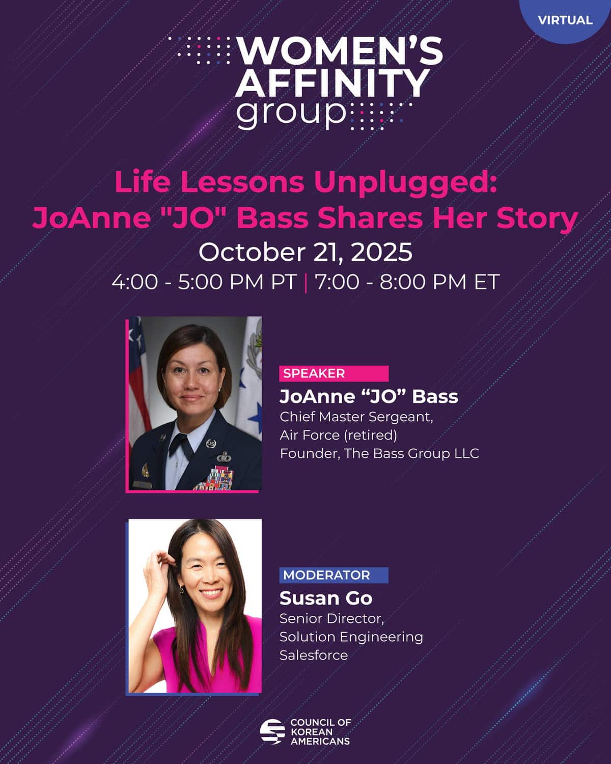 Join us on October 21 from 4:00 – 5:00 PM PT (7:00 – 8:00 PM ET) for Life Lessons Unplugged, a virtual conversation with CKA Member JoAnne “JO” Bass, the first woman and Asian American to hold the highest enlisted level of leadership in the U.S. Air Force.